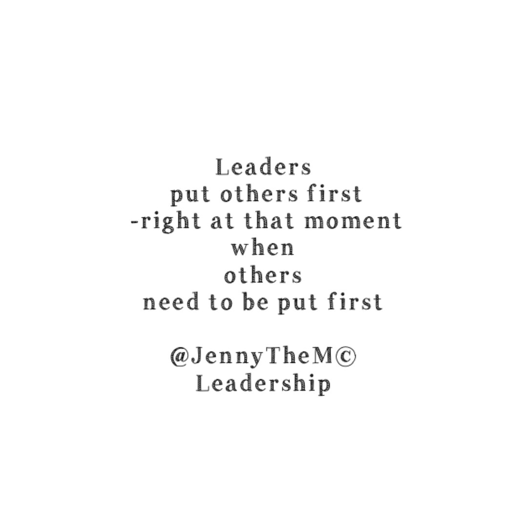 Leaders put others first -right at that moment when others need to be put first . The nurse who helps the elderly man through the heavy non-automatic hospital doors is a leader . The cleaner who stops doing his job to show someone the right way to a department is a leader .